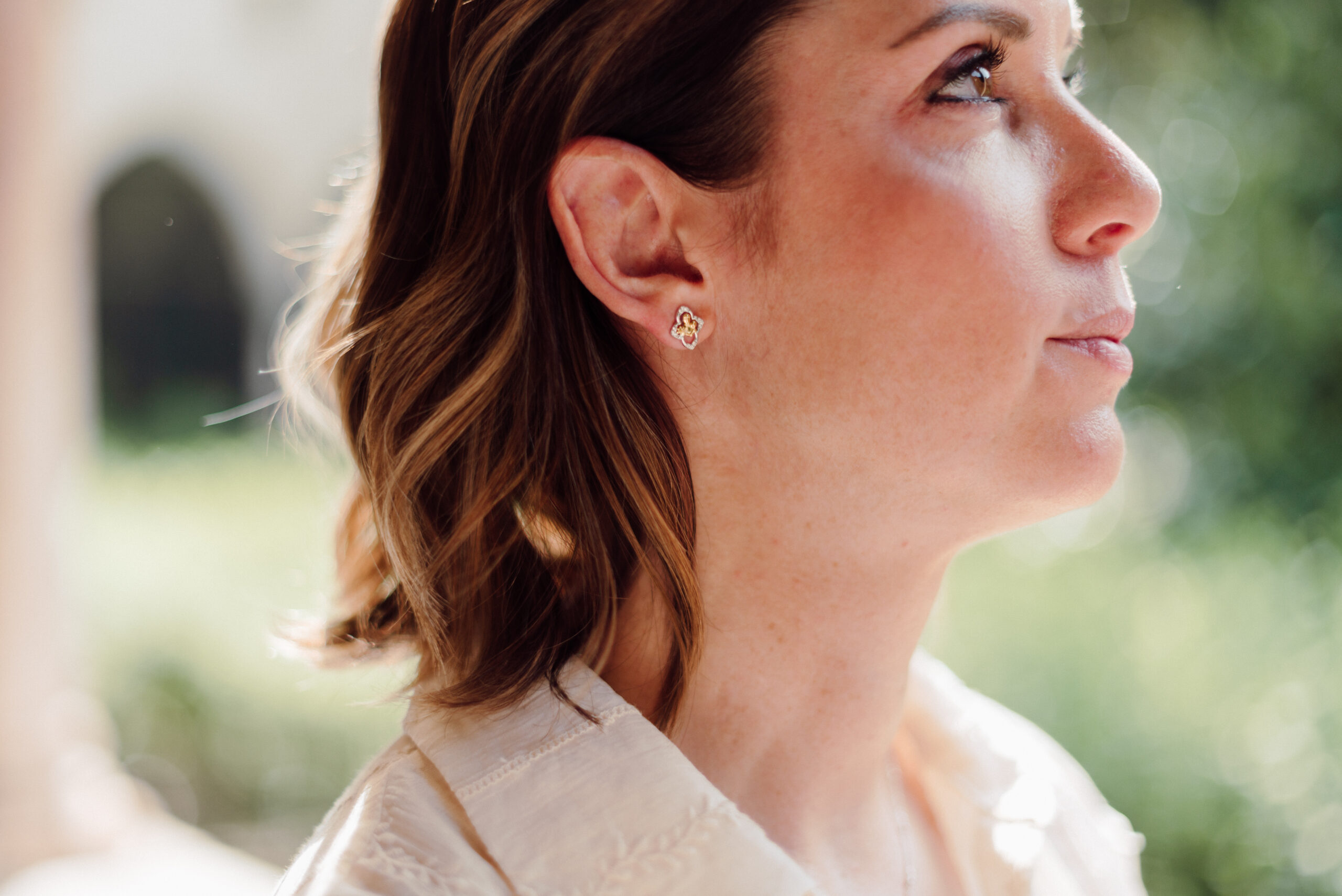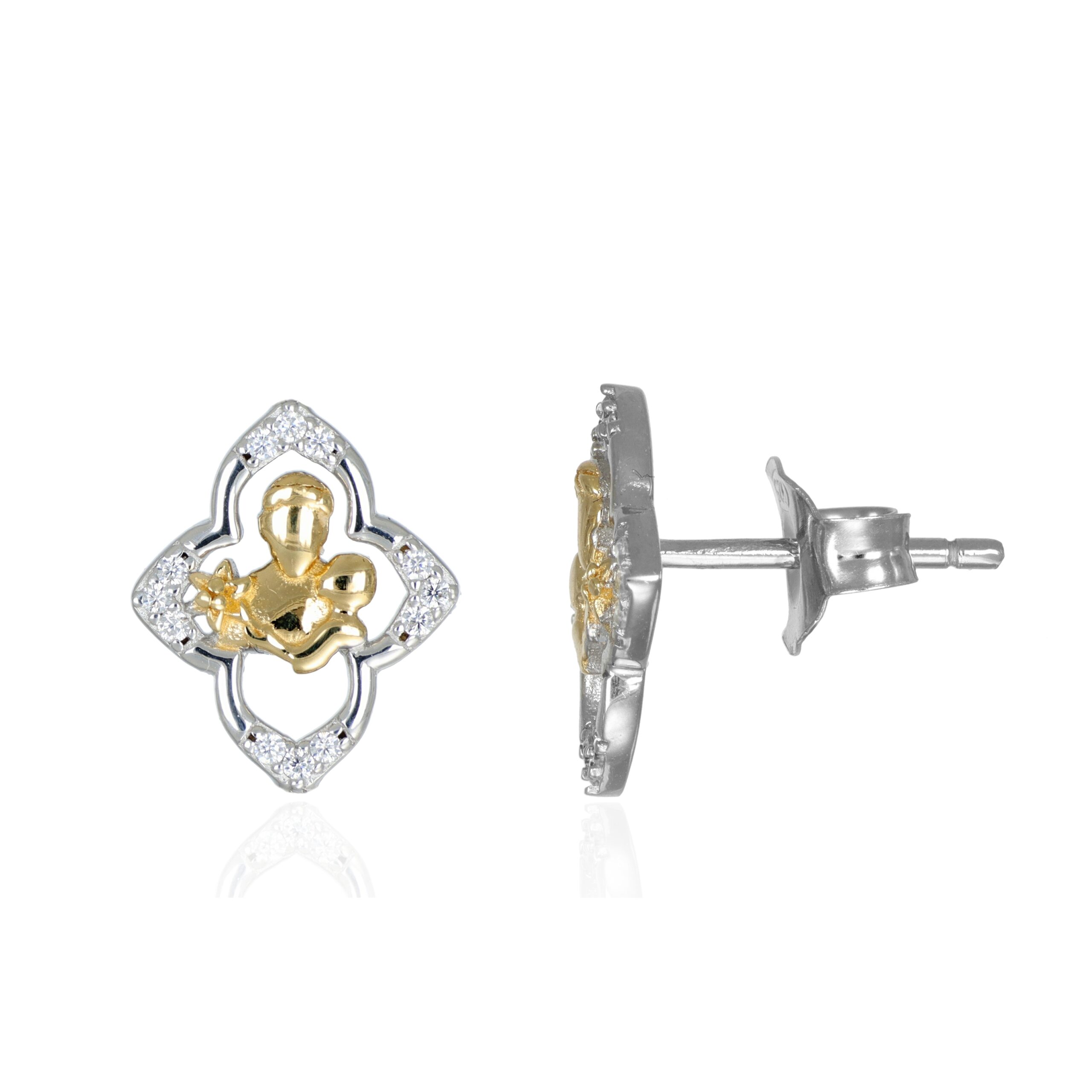 Orecchini in argento 925 rodiato e placcato oro 18k con zirconi bianchi, chiusura a perno con farfallina.